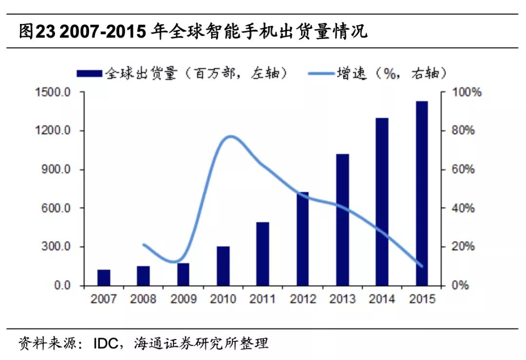 2007年,全球智能機出貨不過1.5億台,五年之後的2012年,全球智能機的出貨量已經到了6億。2015年,這個數字再度刷新,提升到了14.3億部。尤其是2010-2013年,增長率平均60%,簡直是坐着J-20往上走。