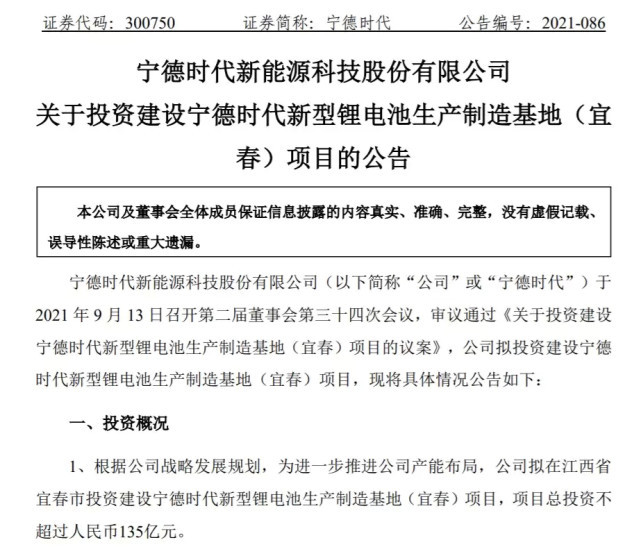 在此之前,寧德時代9月13日公告落户江西宜春,投建新型鋰電池生產製造項目,總投資不超過135億元。