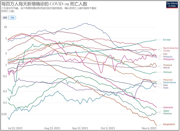這一張圖上是亞洲國家的數據。中國的數據無法在圖上顯示,因為它就一直是無限趨近於零。但是在計算亞洲整體數據時,它和印度的數據就起作用了。你看這裏好些亞洲國家(比如緊靠歐洲的土耳其、伊朗,東南亞的馬來西亞、菲律賓)抗疫表現也不行,但是總體數據怎麼能比世界平均低那麼多呢?如果亞洲能分出東亞、南亞和中西亞,你還能看出進一步的差別。如果東亞還能再細分出東北亞和東南亞,那你就更能看出優秀中還有更優秀了。而中國大陸和中國台灣,那就是極致的優秀了!(抗疫表現極優者其實還有朝鮮,這裏不提也罷。)