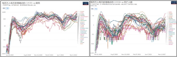 不過看右面這張圖,死亡率可還是降下來不少的。疫苗遏制重症和死亡的效果比遏制感染的效果明顯好許多。這正是西方國家現在雖然染病率依然高企,他們卻還沒有驚慌失措的主要底氣所在。再次感謝(西方)科學的偉大!