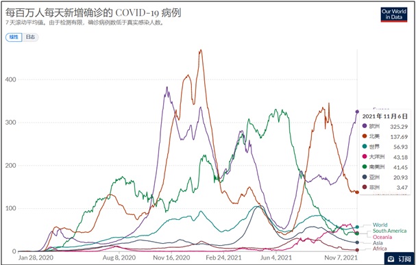 整體大勢,筆者想這樣描述:疫情世界分為歐洲美洲和其它洲份兩個子世界。在時間中的進程大體這樣:先是南、北美洲,然後加上歐洲,從去年夏天開始,就一直輪流壟斷着新冠疫情的各個階段高峯。上一個冬天是歐洲和北美領先。今年春天是南美領先,歐洲和北美大緩。今年夏天以來,南、北美逆向發展。南美一路驟降到世界平均水平以下。北美則在入秋以後再次攀上高峯。然後歐洲又和北美調換位置。現在是歐洲一枝獨秀,在領導新冠疫情最新反撲。