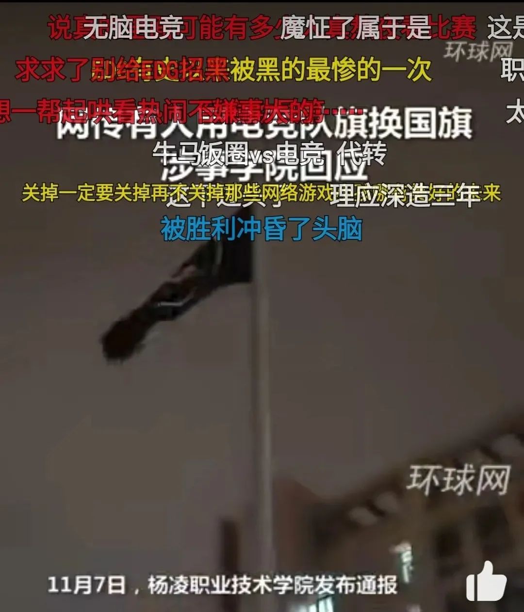 另有網傳某校學生用EDG隊旗替換國旗,涉事的陝西楊凌職業技術學院回應,不存在降國旗的情況:“個別電子競技粉絲情緒激動,在空置旗杆懸掛EDG隊旗,校值班人員及時發現並制止。”