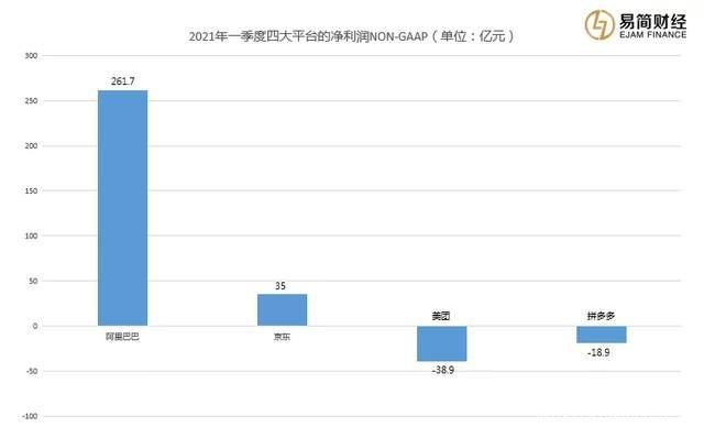 小編以2021年1季度數據為例,對比了四家電商平台的收入情況,WIND數據顯示,四大平台的一季度淨利潤(NON-GAAP)如下: