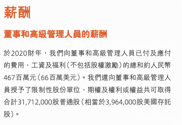 阿里2020年財報顯示:“2020財年,我們向董事和高級管理人員已付及應付的費用、工資及福利總和約人民幣4.67億元。我們還向董事和高級管理人員授予了限制性股份單位、期權及權利或權益共可取得合計31,712,000股普通股。”
