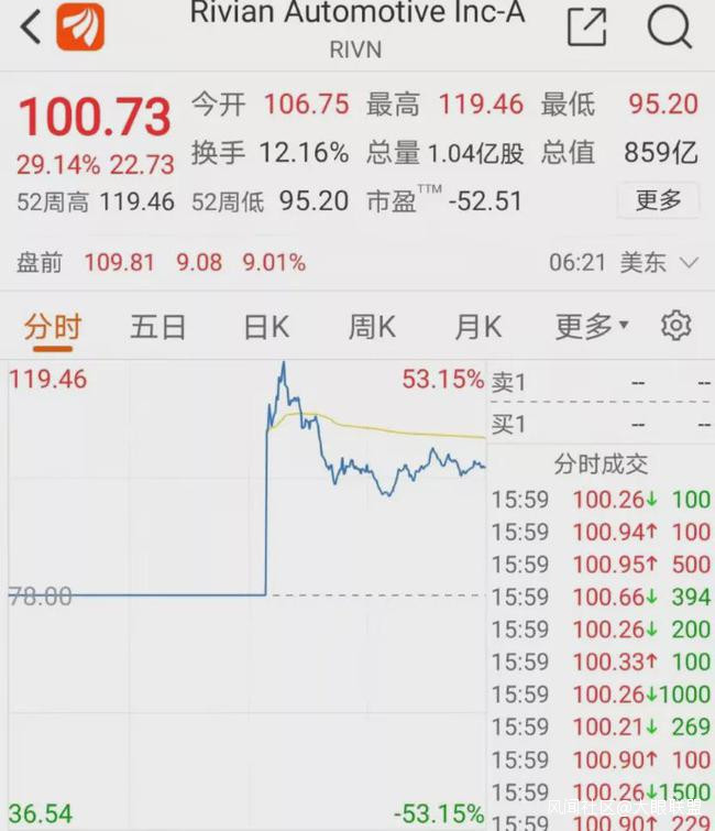 當天上市交易後,Rivian股價一度暴漲超過50%至119.46美元/股,市值一度突破1000億美元。隨後,Rivian回吐部分漲幅,截至收盤漲29.14%報100.73美元/股,市值為859億美元,市值比肩通用汽車(861億美元),超過了傳統車企本田與福特,市值約等於蔚來汽車的1.3倍,理想汽車的2.9倍。