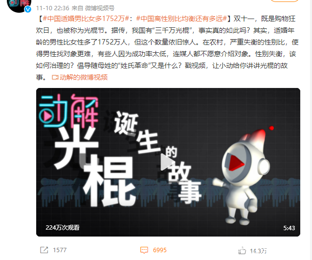 現在性別平等是一個敏感詞,但仔細想想,性別失衡下確實出現了更多的光棍,帶來了更多的社會問題