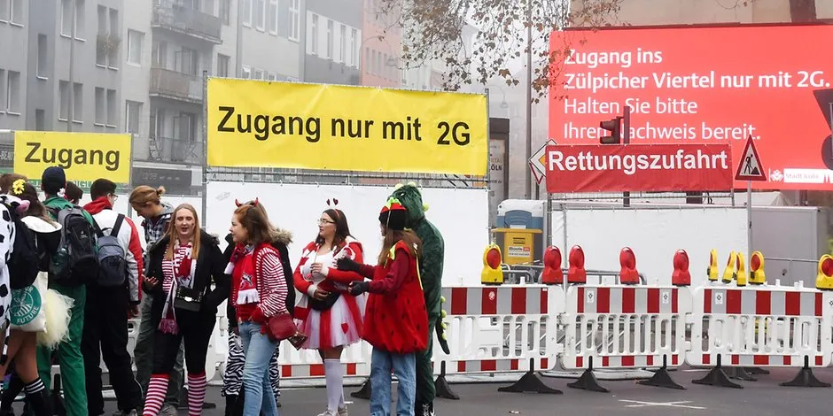 不過,與往年相比,疫情之下的狂歡活動還是有所不同。科隆市政府及“狂歡節籌委會”決定,今年的慶祝活動主要在封鎖的區域進行,且適用2G規則:只有已痊癒或已接種疫苗的人才能進入該區域。當日上午11點前,封鎖的慶祝區外已經排起了長達數百米的長隊,等待工作人員查驗自己的2G證明。一時間,科隆狂歡節彷彿成為了“疫苗接種者的狂歡”。