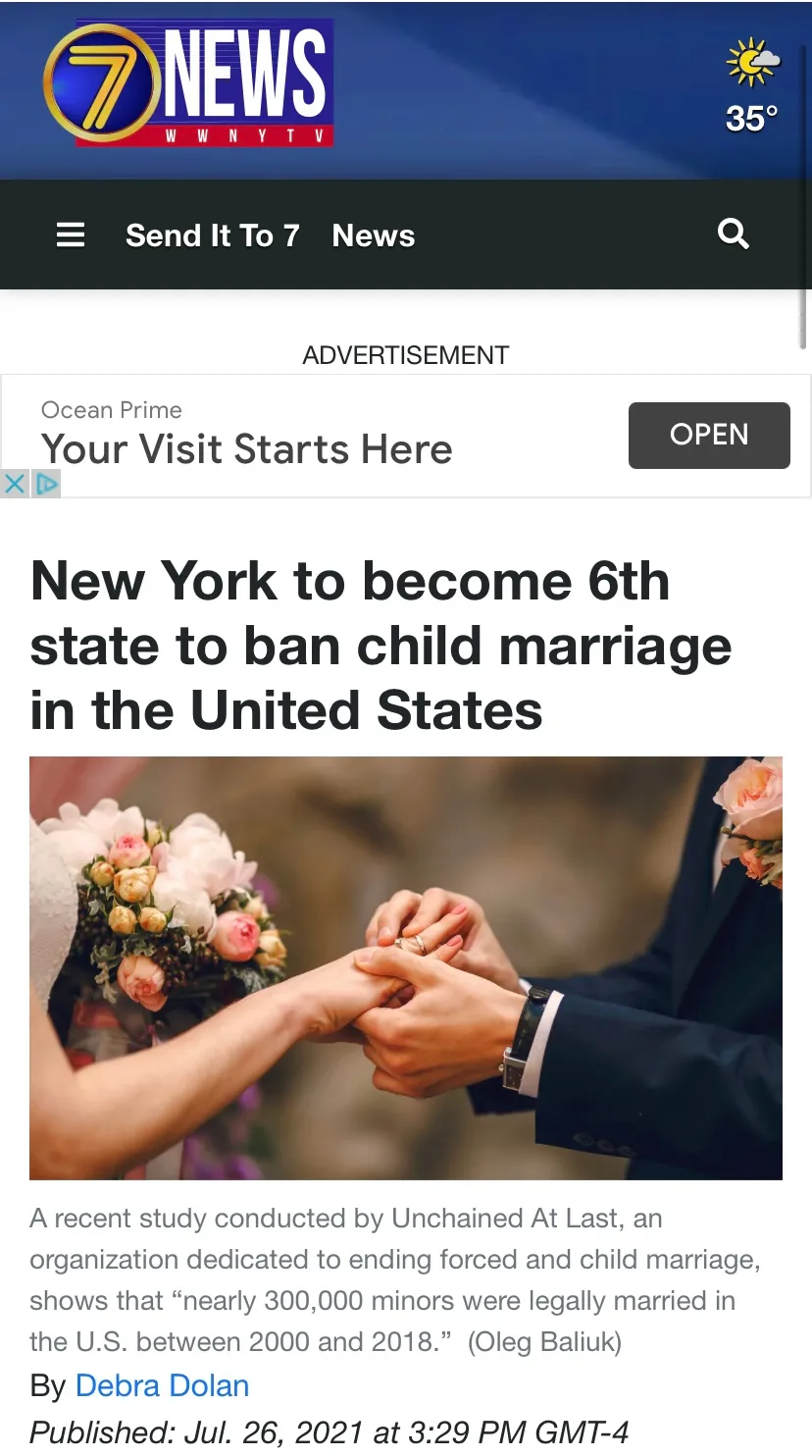 致力於Unchained At Last組織最近進行的一項研究表明,2000 年至 2018 年間,美國有近 30萬名未成年人合法結婚,有少數女孩年僅 10 歲。