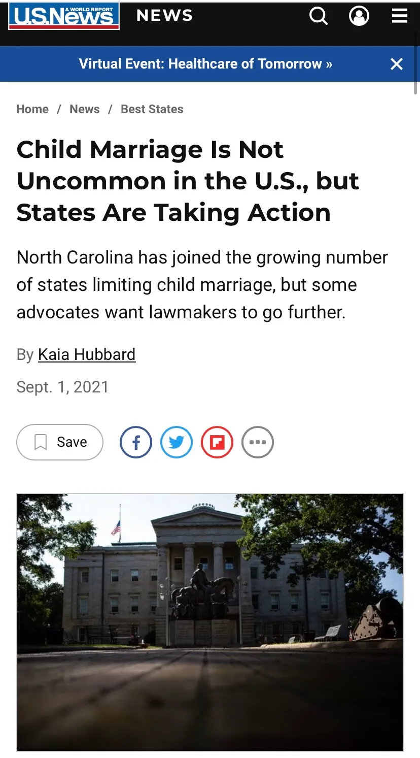 我曾在文章中提到美國大部分州是童婚合法的,有些讀者不相信,非要我拿出證據。我之前還以為這件事情大家基本都知道了,在美國,關於童婚的新聞時有報道。不知道為什麼在國內新聞上不重點報道一下,導致國內同胞對美國依然童婚合法的事情這麼缺乏瞭解,那我們今天就來看看國際大媒體關於美國童婚的新聞報道。只要有基本的網絡信息搜索能力,每個人也都可以很容易找到這些新聞。