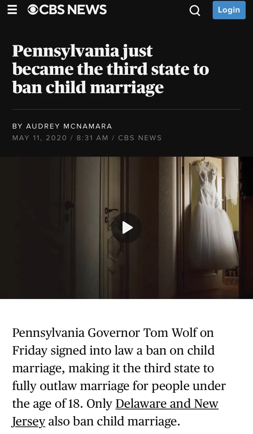 這篇新聞上面説繼特拉華州和新澤西州後,賓夕法尼亞州成為全美第三個徹底禁止童婚的州。通過了法律,規定只有18歲以上才能合法結婚。而在此以前,16歲以下的申請人可以在法庭的批准下獲得結婚證,而16歲到18歲的申請人,可以在父母的同意下獲得結婚證。