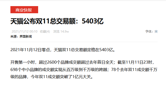 據界面新聞報道,天貓公佈,截至11月12日零點,雙11的總交易額定在了5403億元。