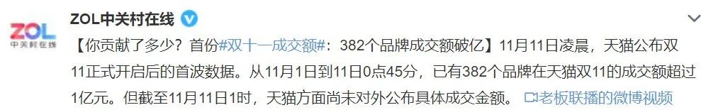 跟天貓雙11的數據顯示,昨天凌晨僅僅用了45分鐘的時間,就有411箇中小品牌銷售額突破千萬,382個品牌成交額超過1億元了。