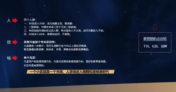 任月表示,“人、貨、場”進入了細顆粒度的精準時代,也為品牌創造了營銷新機會——“下沉、社區、品牌”,即下沉市場藍海、社區場景崛起、新品牌脱穎而出。