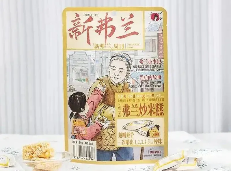 就在這週三,茶顏悦色又推出了“新弗蘭特產計劃”,主打新一代湖南本土零食,在產品包裝上以老報紙為主視覺,還原湖南人記憶裏的人和事。