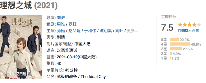 説回孫儷,與劉濤不同,孫儷並不高產。這幾年她主演的作品,豆瓣評分也都中等偏上,即便是口碑略低的《安家》,豆瓣評分也過了及格線。孫儷選劇本能力不容小覷。