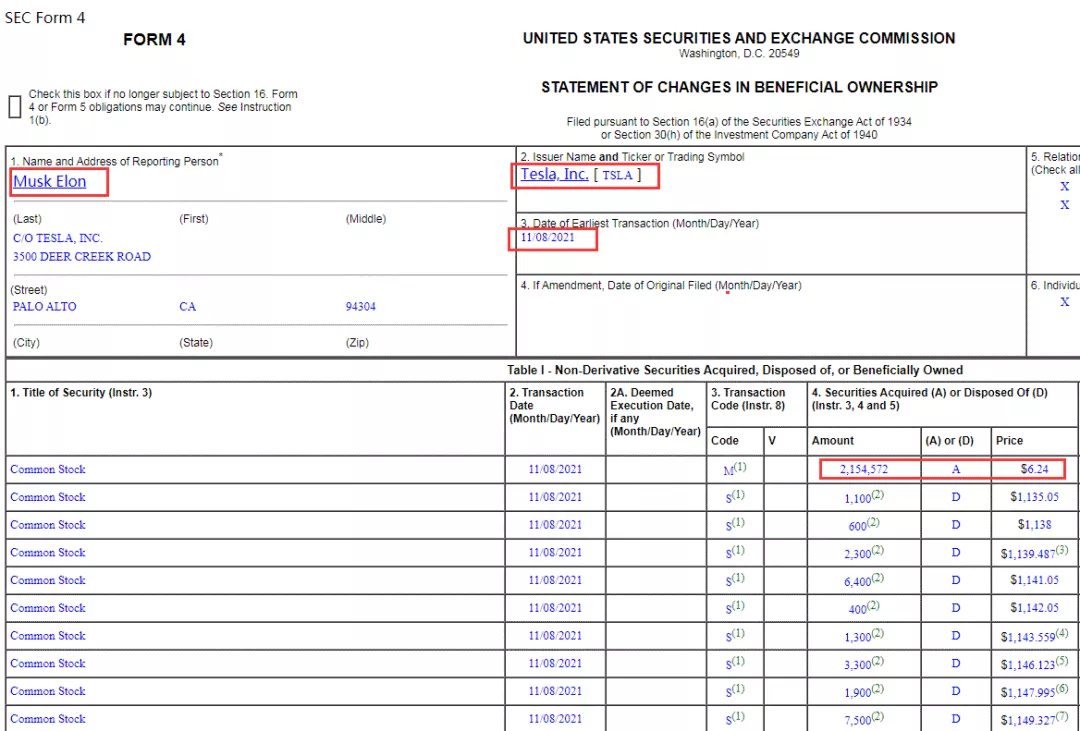 **據美國證監會(SEC)最新文件,特斯拉CEO馬斯克近期出售了特斯拉股票,套現超11億美元。**文件顯示,馬斯克11月8日行使了超過215萬份股票期權,以6.24美元的價格購入2154572股股票,這部分期權將於2022年8月13日到期。