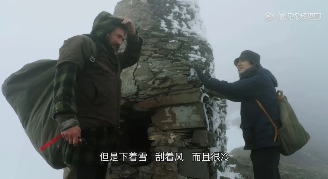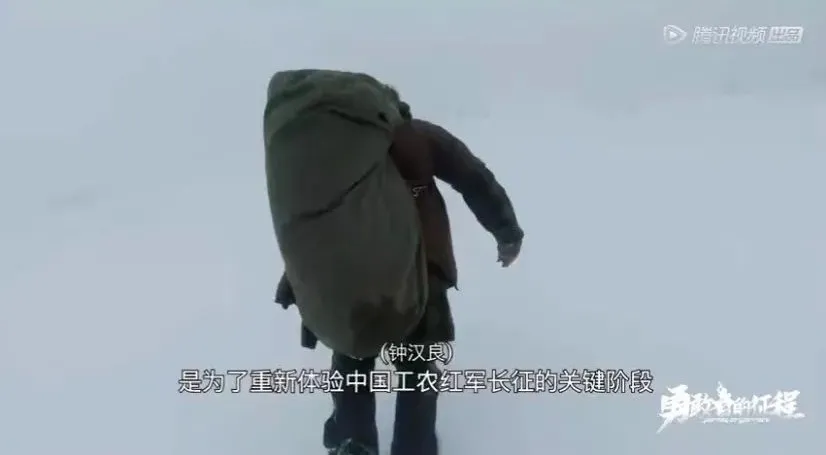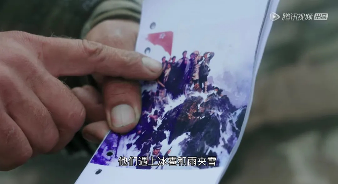 在翻越峭壁時,鍾漢良體會到了紅軍為了躲避敵軍而採取的出其不意的戰略意圖,壓縮時間從險處行軍。到達山頂陣亡將士紀念塔,信封裏的照片讓兩位探險者與革命先烈達成了共情式體驗。那一年他們也遭遇了冰雹與雨夾雪,相似的天氣面對的卻是迥然不同的歷史環境。