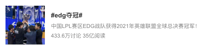 但今天,除了超過1億用户觀看2021年英雄聯盟全球總決賽,11月7日中國戰隊EDG奪冠的話題在各大社交平台被刷屏、微博話題閲讀量超過35億次!