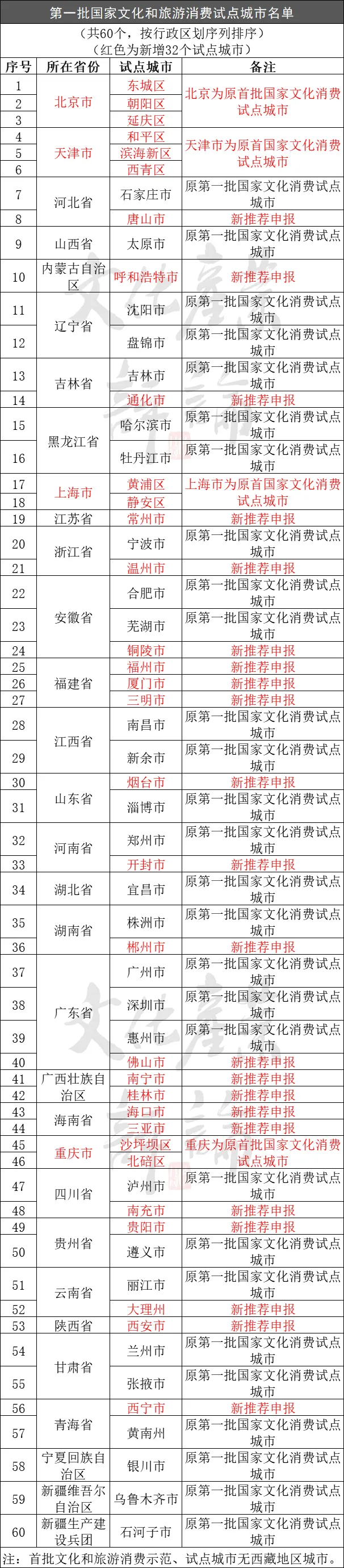 因此,去年12月公佈的第一批15個示範城市和60個試點城市名單中,扣除河北省、內蒙古自治區、吉林省等已有國家文化消費試點城市的23個省、自治區和新疆生產建設兵團(不含4個直轄區市)推薦申報示範城市13個、備案申報試點城市28個外,名義上,新增了2個示範城市和32試點城市。