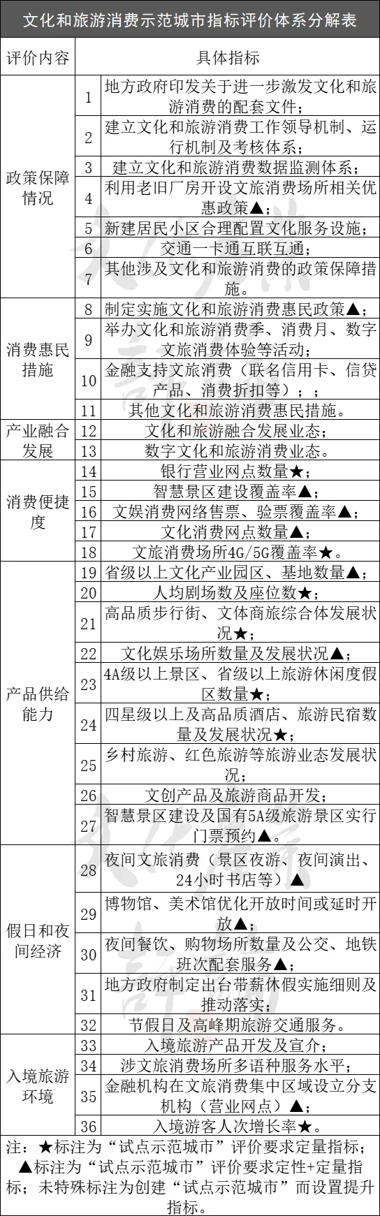 **一是對標指標評價體系。**去年10月,三部委在《關於開展文化和旅遊消費試點示範工作的通知》中圍繞創建目標,專門以附件形式印發了《文化和旅遊消費試點示範工作評價參考》,內容涵蓋政策保障、消費惠民措施、產業融合發展、消費便捷程度、產品供給能力、夜間和假日經濟、入境旅遊環境等7類36項具體指標。