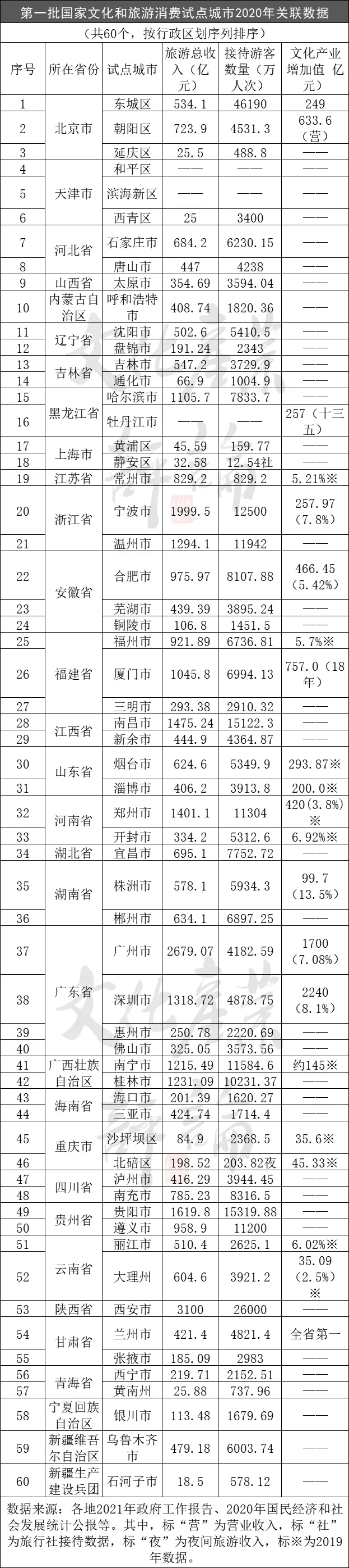 **三是對標文旅消費關聯指標。**為印證“第二批15個文化和旅遊消費示範城市模擬研判結果”的準確率,文化產業評論(ID:whcypl)對60個首批文化和旅遊消費試點城市年旅遊總收入、遊客接待量及文化產業增加值等數據進行收集整理,通過抽樣分析同樣可以作為重要支撐。