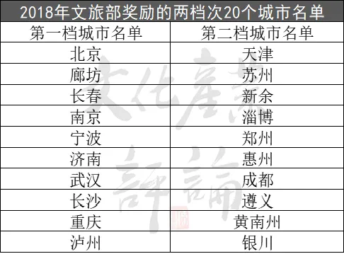 2018年6月,新組建的文化和旅遊部對27個省份45個文化消費試點城市進行檢查驗收,並組織實施了試點城市獎勵計劃,對北京等20個城市分兩檔次給予了獎勵,其中第一檔城市10名每城獲得20萬元獎勵,第二檔城市10名每城獲得12萬元獎勵。