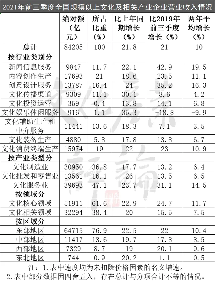 同時,國家統計局發佈前三季度文化數據顯示,全國規模以上文化及相關產業企業實現營業收入84205億元,同比增長21.8%,兩年平均增長10.0%,比2019年前三季度同比增速加快2.4個百分點。按行業類別分,新聞信息服務、創意設計服務、內容創作生產等3個行業兩年平均增速超過兩位數,分別為19.5%、16.3%和11.1%;文化消費終端生產兩年平均增長10.9%,增速明顯快於其他2個行業。