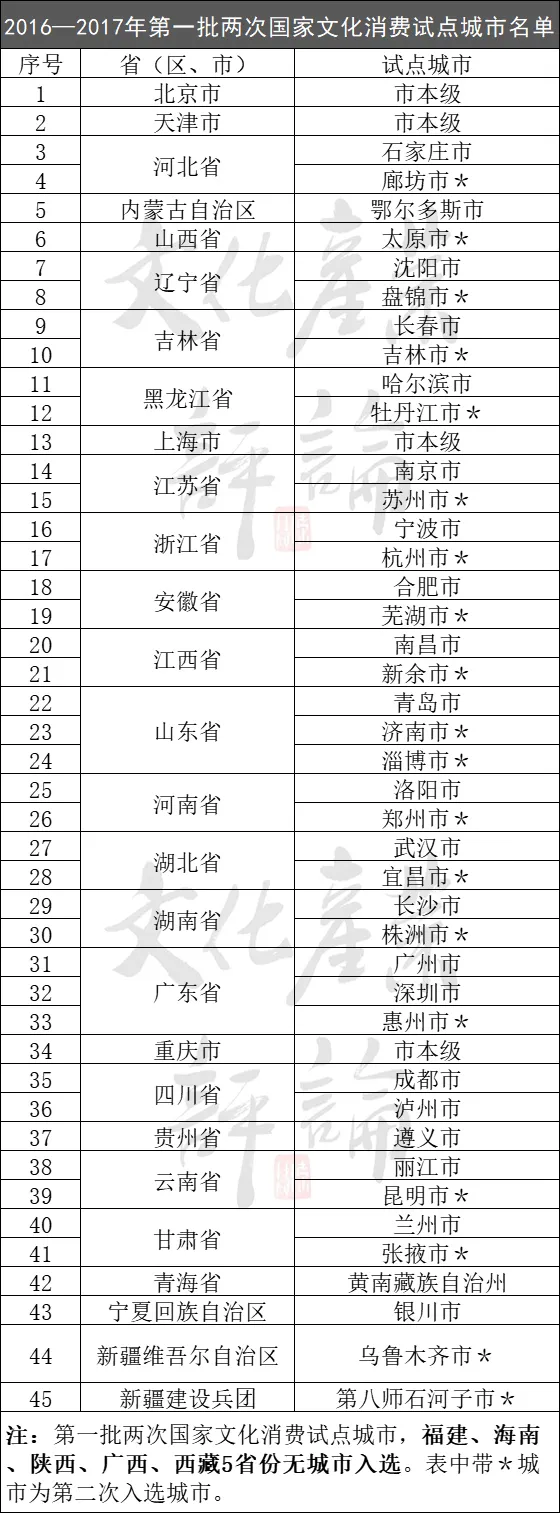 根據文化消費試點工作計劃,原文化部、財政部於2016年6月公佈了第一批第一次26個國家文化消費試點城市名單,2017年2月公佈第一批第二次19個試點城市名單,**第一批兩次在全國範圍內共確定45個城市為國家文化消費試點城市。**經過一年多的試點,初步形成了直接補貼消費者、開展文化惠民活動、擴大文化消費有效供給、改善文化消費條件、創新公共文化產品和服務等試點模式。