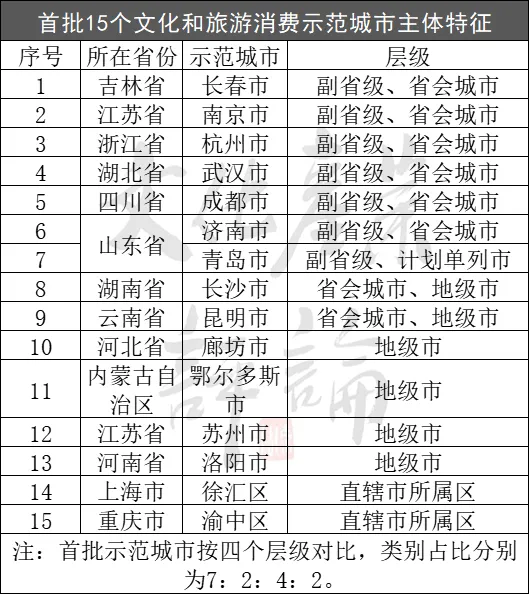 **二是對標首批示範城市顯基特徵。**從首批15個示範城市屬性看,除了上海徐彙區、重慶市渝中區為新推薦申報示範城市外,其餘13城均為原國家文化消費試點城市。從申報主體層級看,副省級城市有7個,分別是武漢市、南京市、成都市、杭州市、濟南市、青島市、長春市(青島為計劃單列市,其它均是省會城市);非副省級城市的省會城市2個,分別是長沙市、昆明市;地級市4個,分別是廊坊市、鄂爾多斯市、蘇州市、洛陽市;直轄市所屬區2個,分別是上海徐彙區、重慶市渝中區。