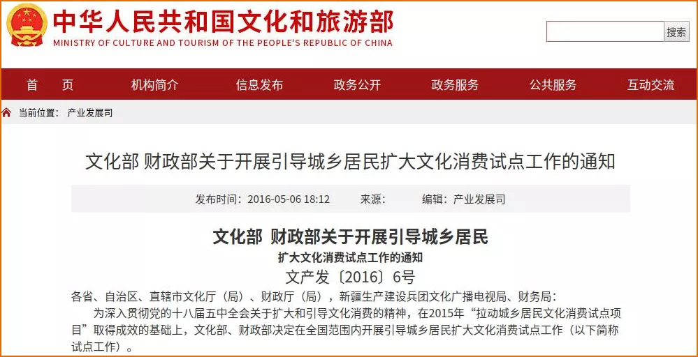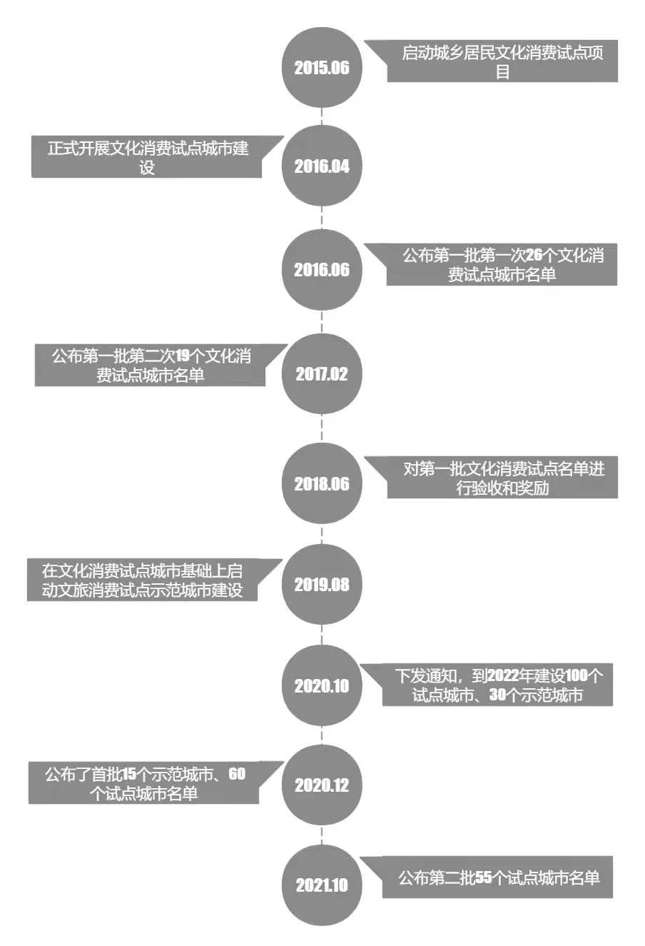 2015年6月,原文化部、財政部聯合開展了拉動城鄉居民文化消費試點項目,決定從東、中、西部選擇典型地區進行政策試點。2016年4月,兩部門聯合印發《關於開展引導城鄉居民擴大文化消費試點工作的通知》(文產發〔2016〕6號),正式在全國範圍內開展擴大文化消費試點工作。