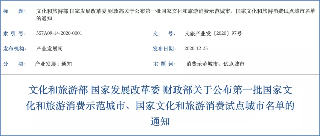 2020年10月,《國家文化和旅遊部、發展和改革委員會、財政部關於開展文化和旅遊消費試點示範工作的通知》明確提出,到2022年建設100個試點城市、30個示範城市,推動形成若干促進文化和旅遊消費的經驗模式及長效機制,培育壯大文化和旅遊消費新業態、新模式,助力形成強大國內市場。