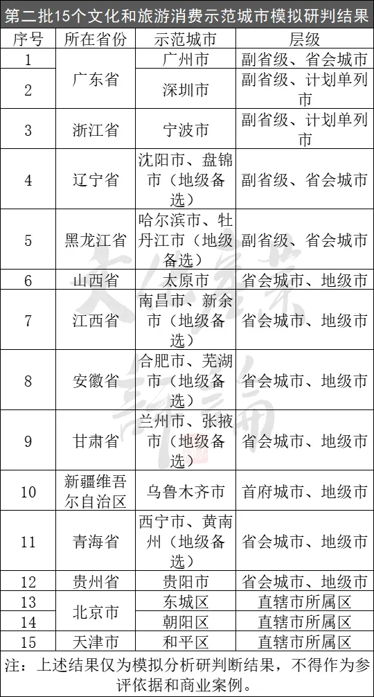 據此類別比例模擬遴選,第二批15個示範城市在副省級城市層級,有望從廣州市、深圳市、哈爾濱市、瀋陽市、西安市、廈門市、寧波市、大連市等餘下8個副省級城市(其中,大連、寧波、廈門和深圳4城為計劃單列市)產生。鑑於福建、陝西無國家文化消費試點城市,廈門、西安兩市沒有可能;遼寧省瀋陽市和大連市或擇其一,廣州市、深圳市、哈爾濱市、瀋陽市、寧波市等5城機率最大。