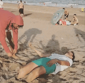 腰身力量不夠,那就在海灘上來一場完美復刻,沙灘上經常會看到模仿充氣人偶的新玩法。