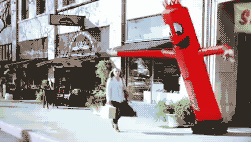這種沒譜的動畫總有各種新奇的辦法找到觀眾笑點,充氣人偶——或者説古怪的揮舞手臂的充氣式搖擺管人,就是作為一段動畫世界的廣告出現的。