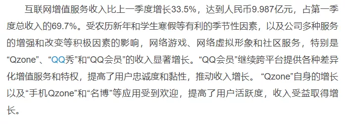到了 2008 年第一季度, QQ 空間、 QQ 秀和 QQ 會員三者為騰訊貢獻了 69.7% 的收入。