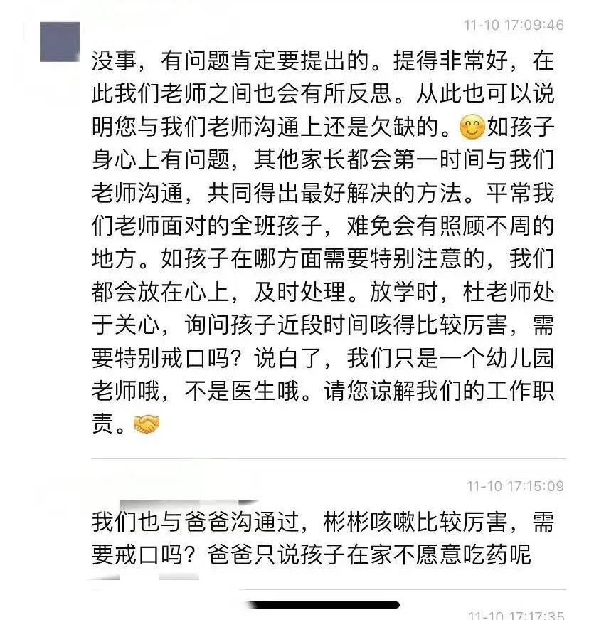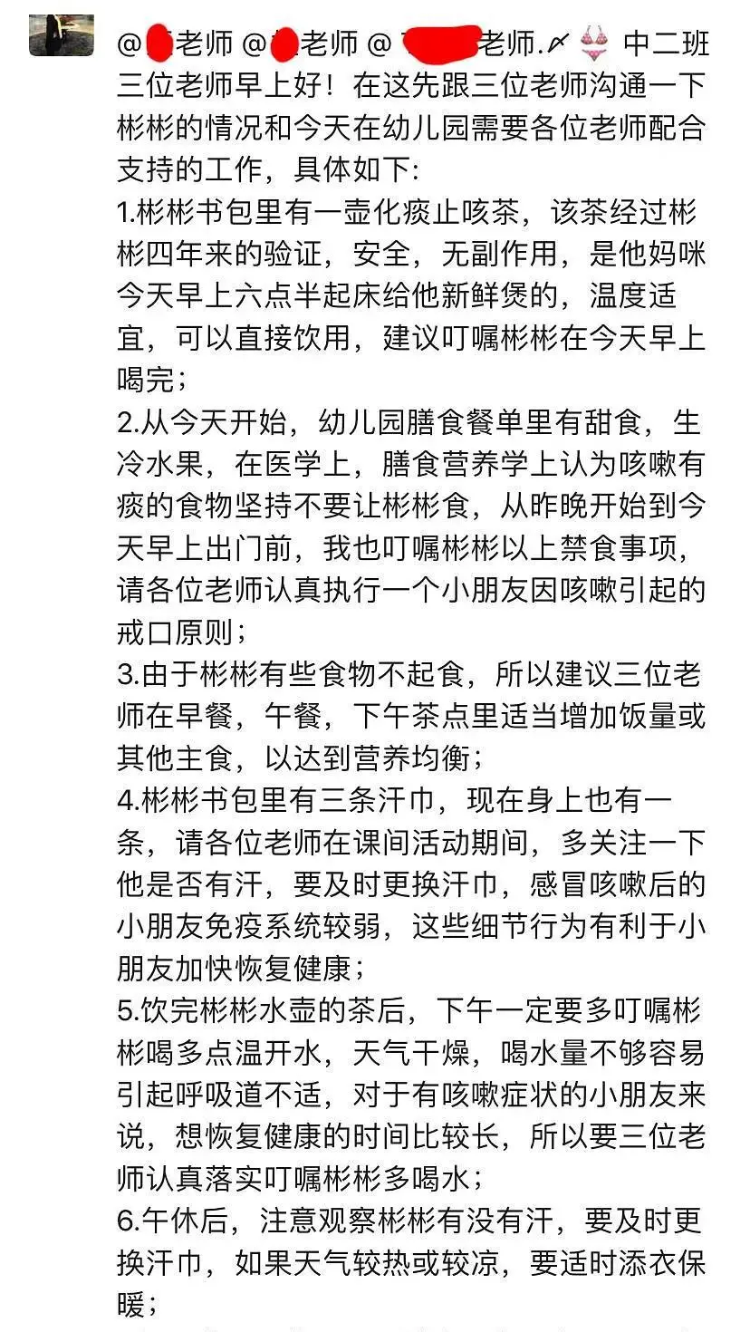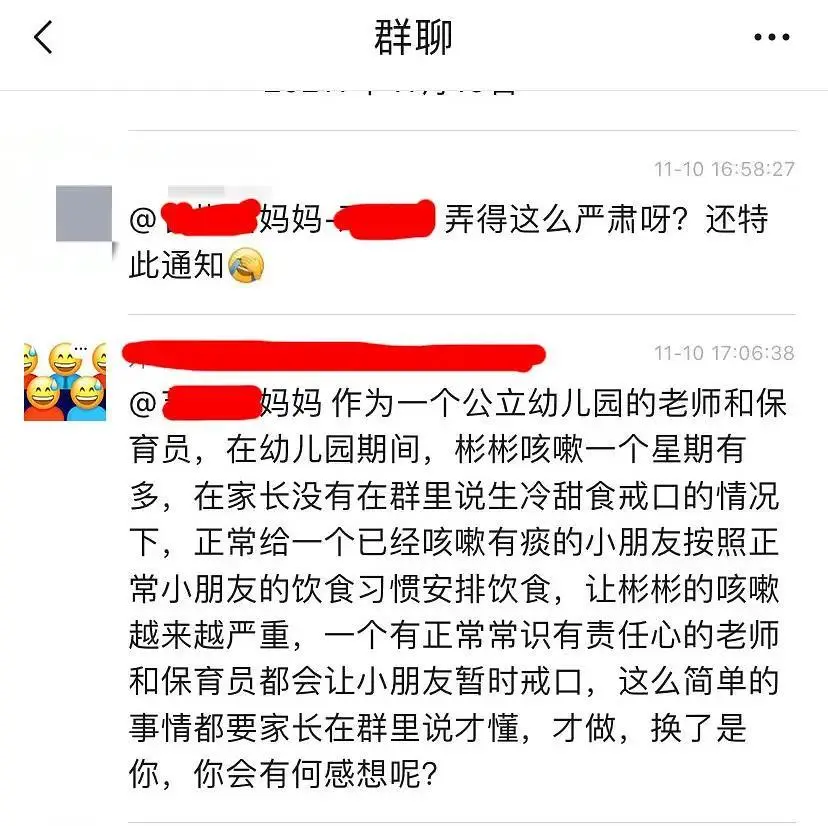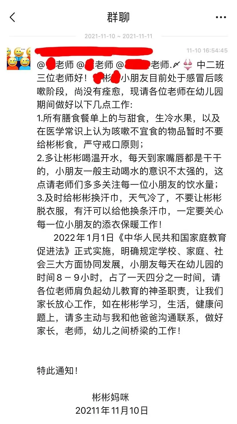 起因很簡單,家裏小朋友感冒咳嗽,然後這位彬彬媽咪在幼兒園班羣裏發消息,請老師多留意關照。
