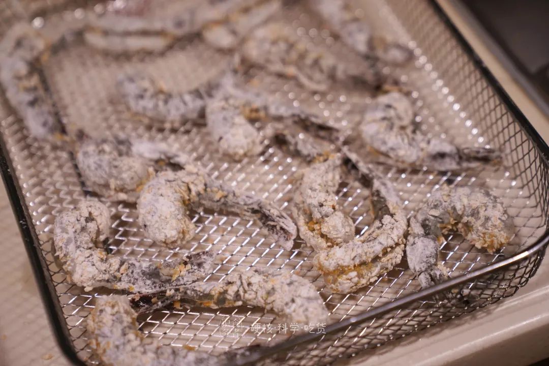 把裹均勻粉衣的蝦,放入鏤空的炸籃裏。一般烤箱沒配,就網上買一個就行,非常實用。