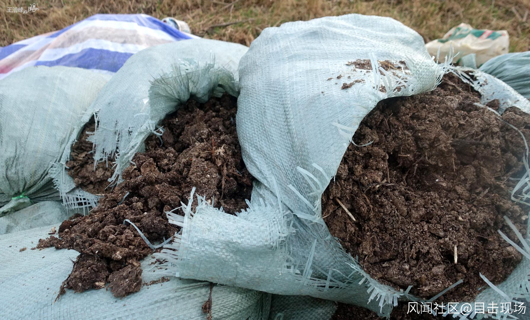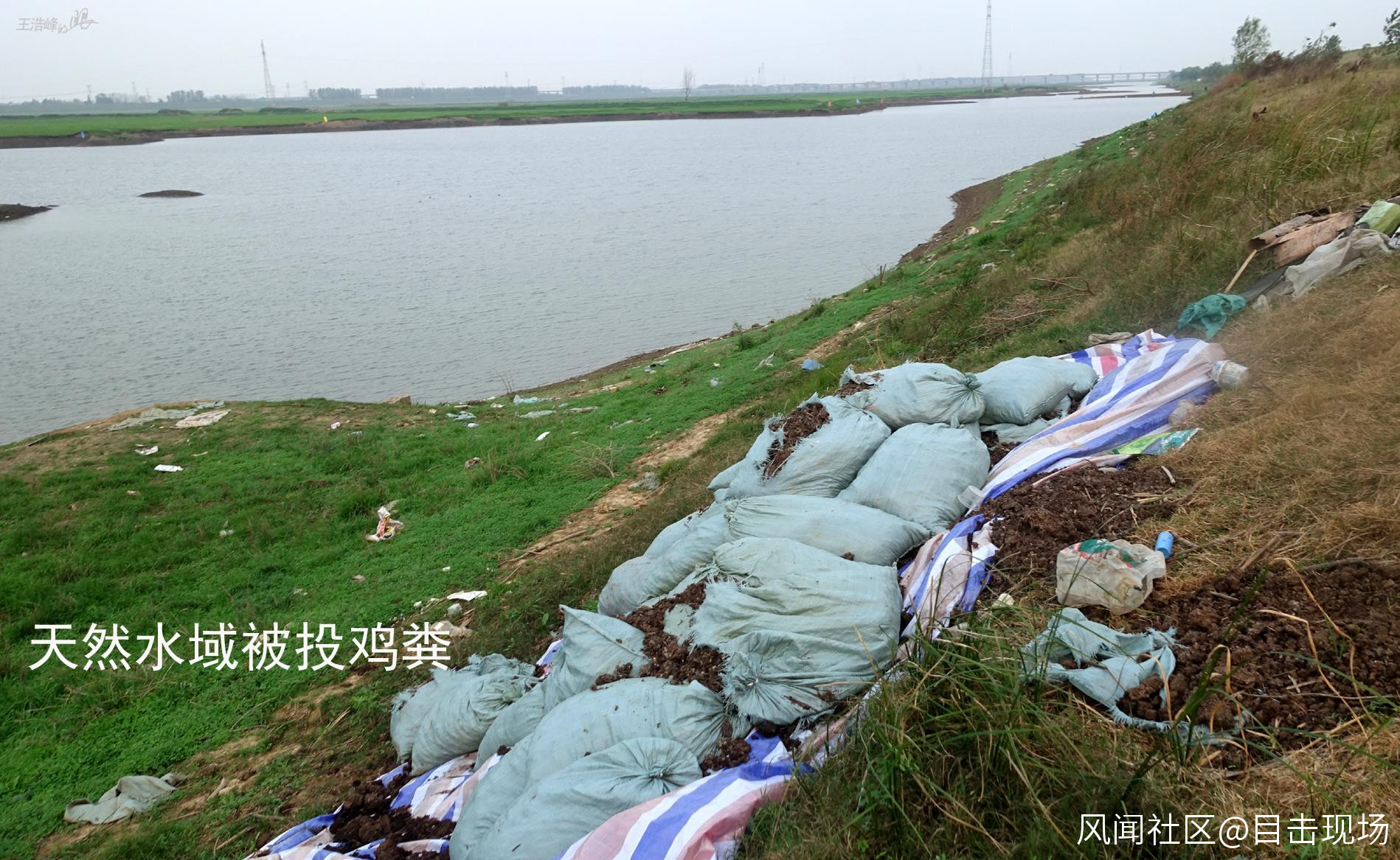 沿水岸都是扔的投放了雞糞的蛇皮袋及撒落的雞糞,水岸上還見到未投放完的雞糞有幾十包,有的包裝袋已破爛雞糞外露,河灘臭氣逼人。在投放過雞糞的水域,明顯見到有打眼的污染物漂浮。