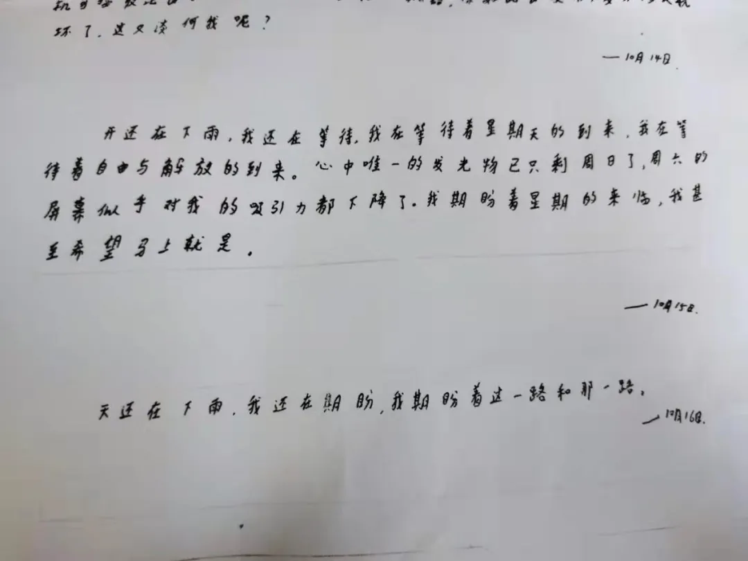 其實早在女兒失蹤那天(24日),在派出所裏,夫婦倆見到了小悦的班主任牟老師,還有半個月前被他沒收的小悦的手機,以及一沓6頁日記,從10月8日記到16日,“現在看來,就是遺書了。”劉兵説。