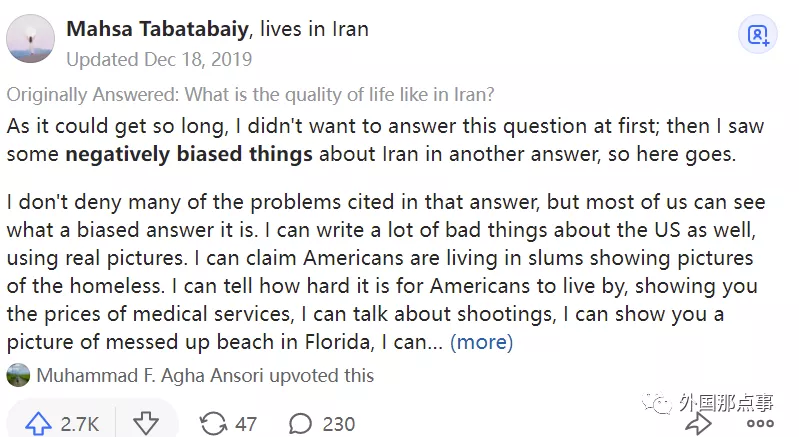 在話題"伊朗的生活質量如何?“中,伊朗網民 Mahsa Tabatabaiy 侃侃而談,獲得了2700+高贊。