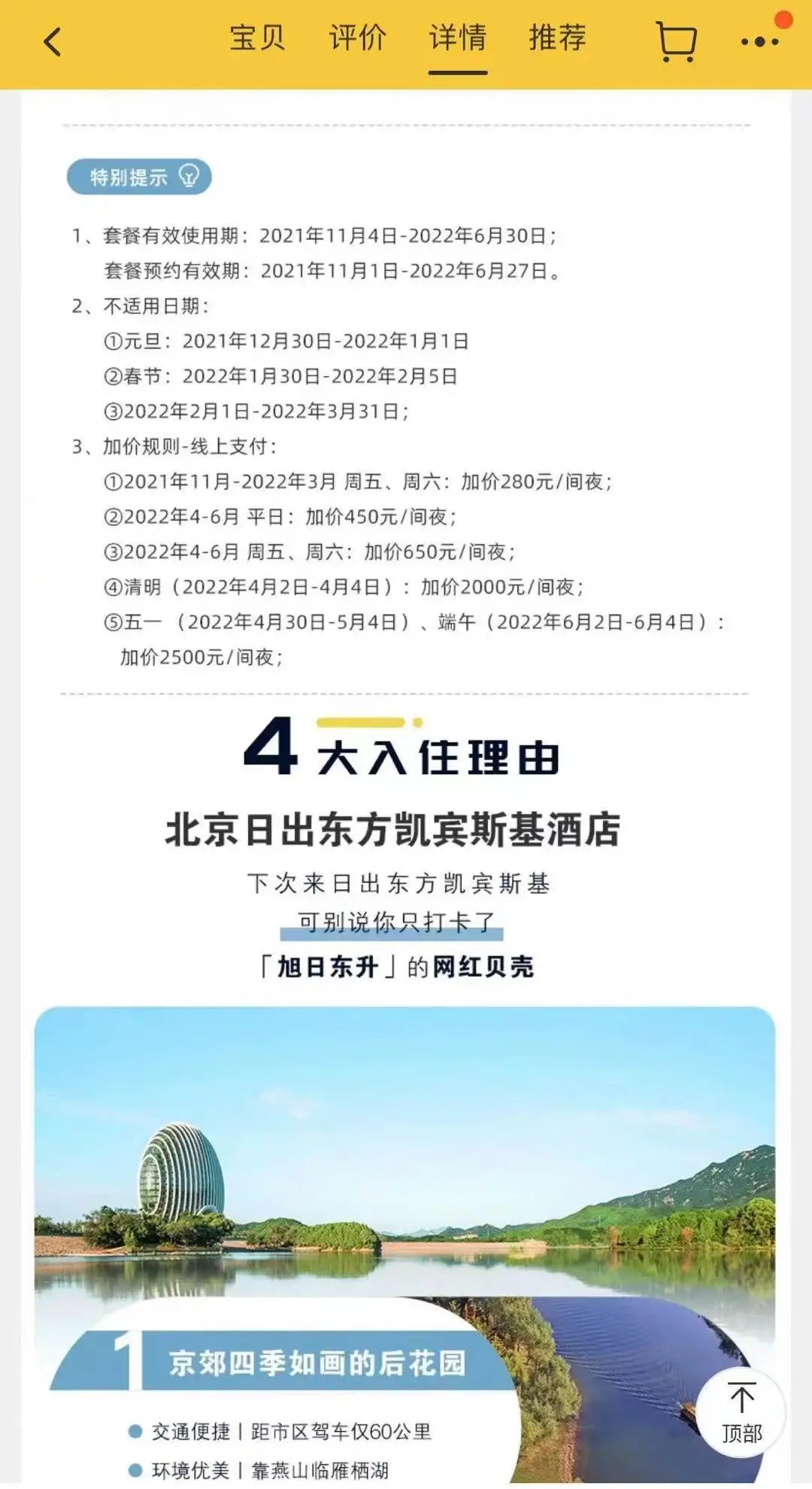 事情的原委是張女士趁着雙11優惠,在飛豬旅行上預定了北京市懷柔區雁棲湖凱賓斯基日出東方的兩個房間,一晚住宿+雙早。優惠價943元,預付定金99元,2間定金198元,有效期至2022年6月底。讓她沒想到的是預定後,房間平日入住要加價450元/夜;週五、週六加價650元/夜。清明節加價2000元/夜,五一、端午加價2500元/夜。而且這些加價規則在她看來隱藏的很深。