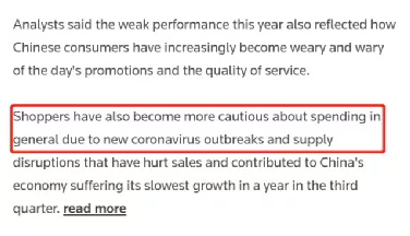 除了上述這篇評論文章外,路透社今天還刊登了另一篇吐槽中國“雙十一”的新聞。和上一篇吐槽我們“過度消費”矛盾的是,這條新聞則是説中國經濟下滑、居民不敢消費,導致今年雙十一的數據沒有以往耀眼。