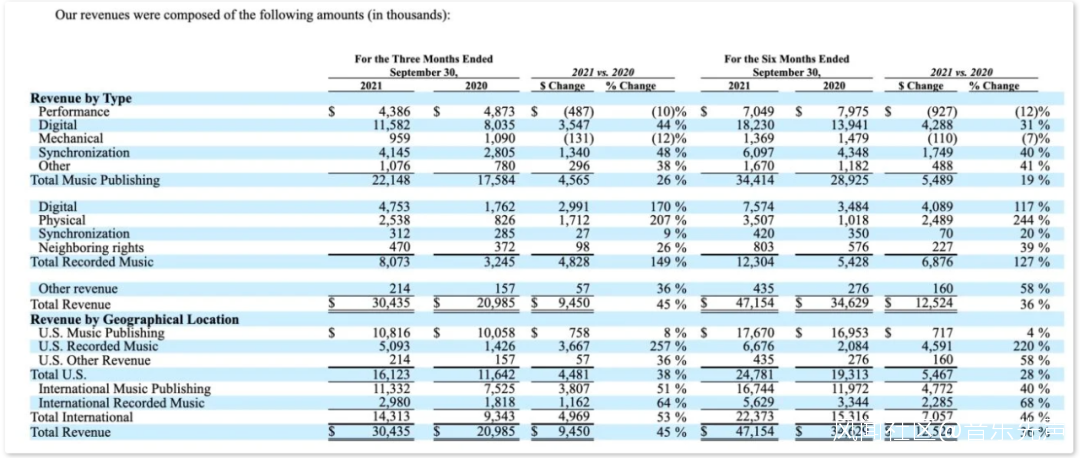 詞曲版權版塊,收入為2210萬美元,同比增長26%。該公司表示,增長是由其數字渠道和同步權的強勁表現推動的。其中,數字音樂的詞曲版權收入為1158萬美元,同比增長44%,與上一季度的803萬美元相比,環比增長328萬美元;第二大收入驅動因素是同步權授權收入,達410萬美元,同比去年的280萬美元,增長48%。