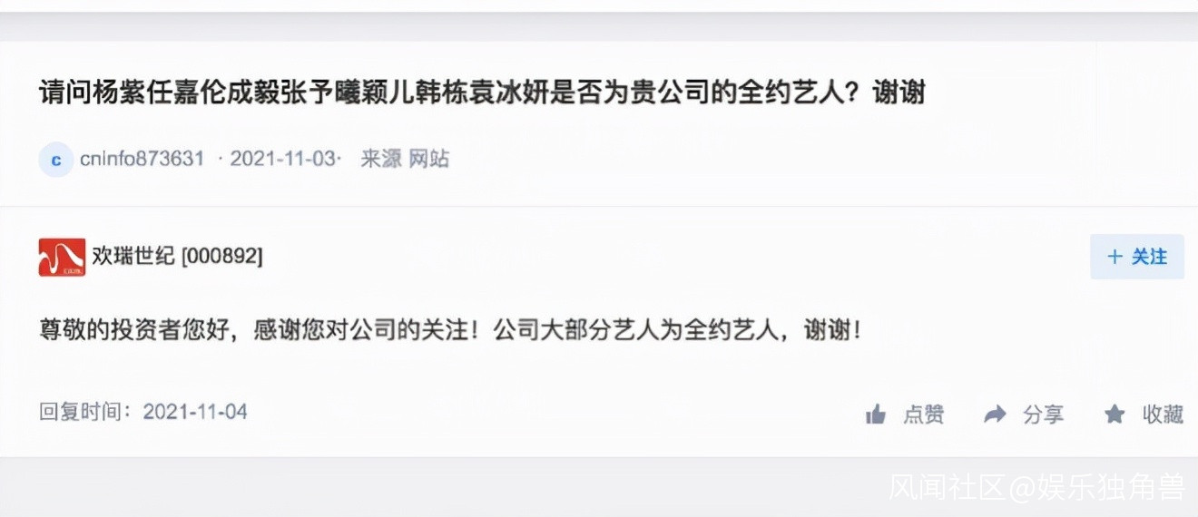 影視內容的乏力、頭部藝人偏好外劇,帶給歡瑞世紀的影響同樣是顯著的:**影視板塊收入下滑,藝人經紀業務上行。**2020年,歡瑞世紀的藝人經紀收入超過影視板塊,但同樣表露出了對頭部藝人的高度依賴性。——深交所互動易的投資者問答中,也曾在11月問及“楊紫任嘉倫等人”的合約問題。