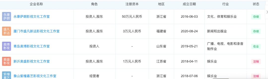 一個值得注意的點在於,在明星爭相入局資本市場的這幾年,楊紫同樣有所籌謀。企查查APP顯示,目前楊紫名下仍未存續狀態的公司有永康薩朗影視文化工作室、廈門市盛凡新遠影視文化工作室和青島奧博影視文化工作室。這三家公司都由楊紫擔任投資人,註冊資本1萬至50萬不等。而曾經的股權之説不攻自破。