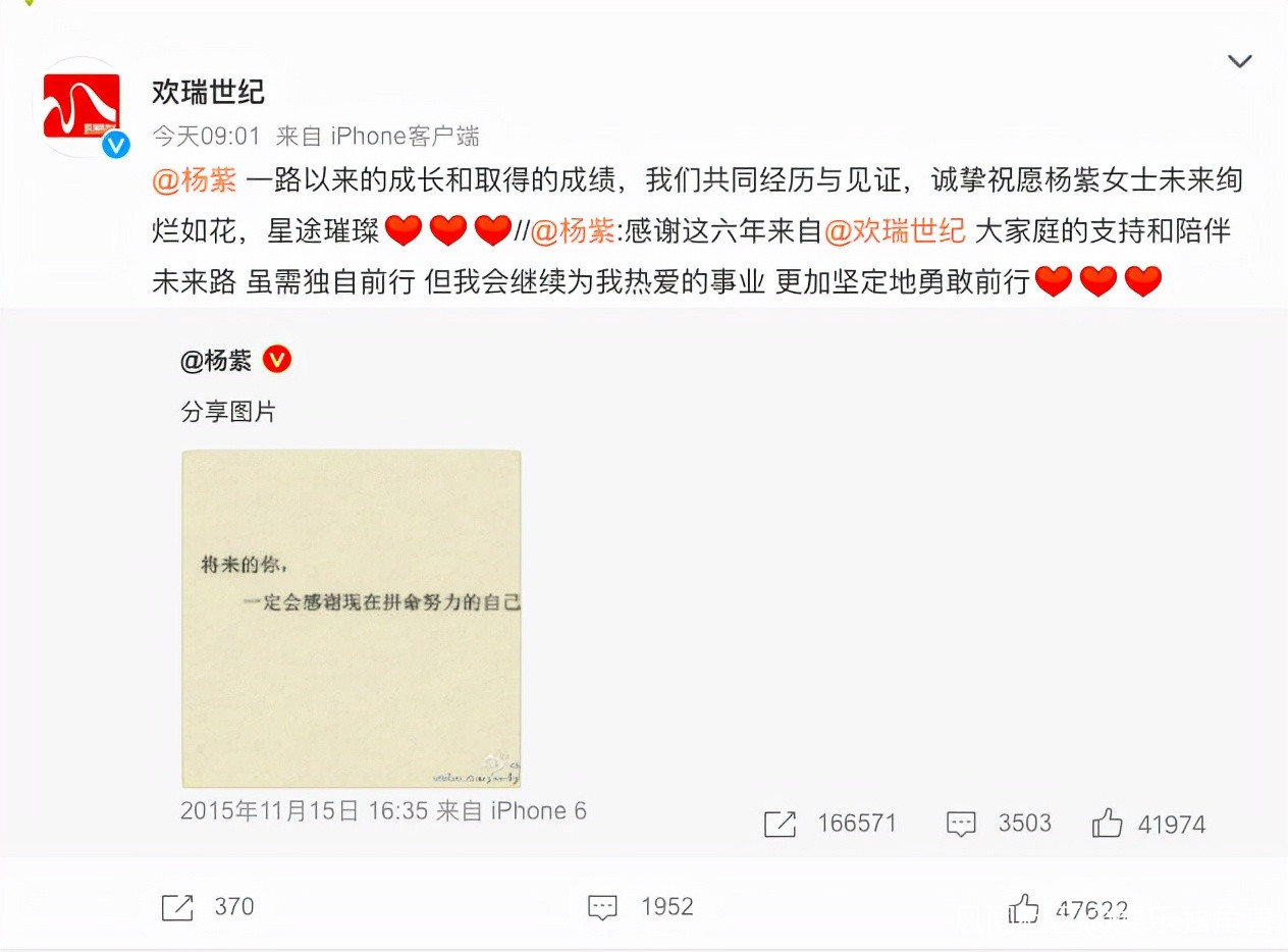 “感謝這六年來自@歡瑞世紀大家庭的支持和陪伴,未來路,雖需獨自前行,但我會繼續為我熱愛的事業,更加堅定地勇敢前行”。