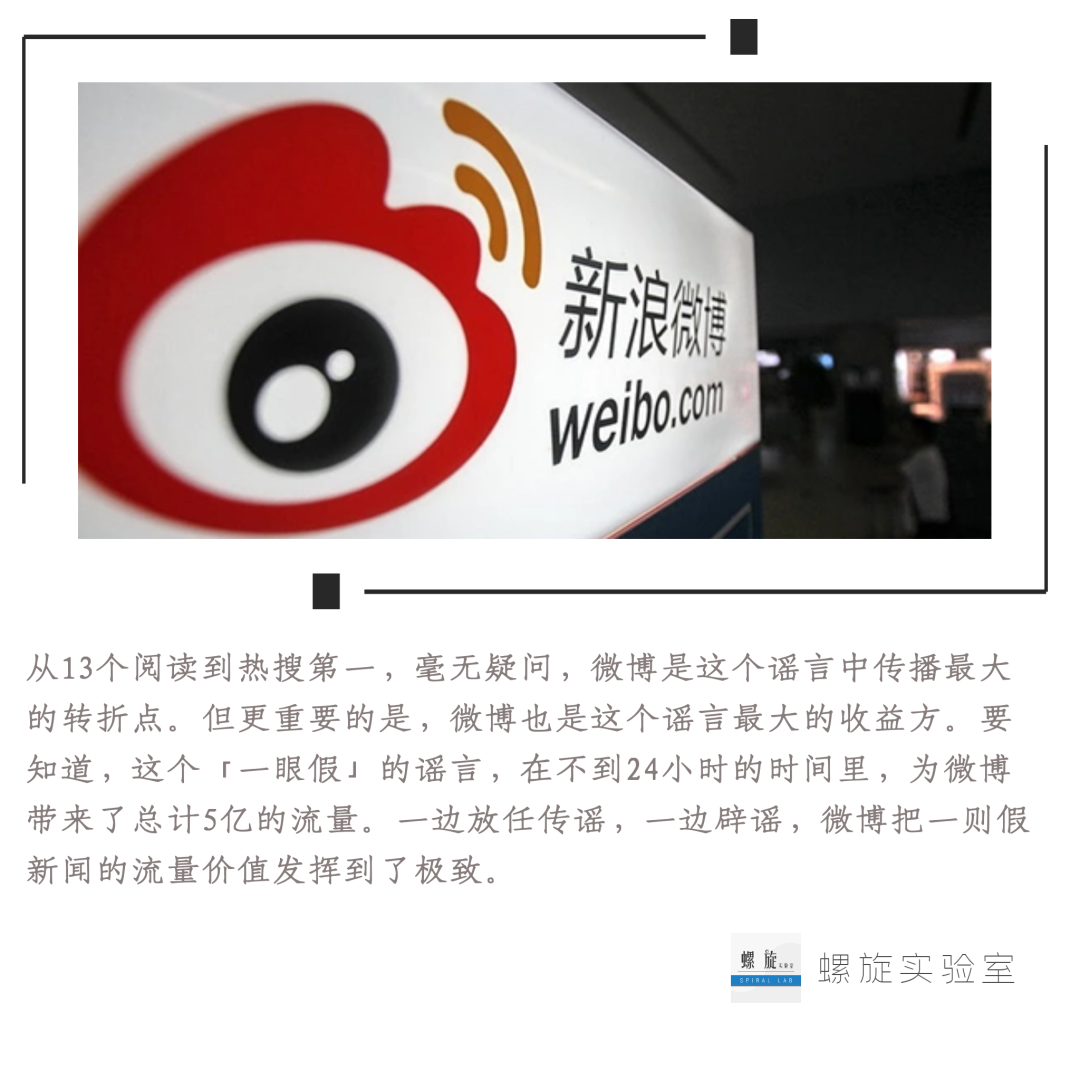 從13個閲讀到熱搜第一,毫無疑問,微博是這個謠言中傳播最大的轉折點。但更重要的是,微博也是這個謠言最大的收益方。要知道,這個「一眼假」的謠言,在不到24小時的時間裏,為微博帶來了總計5億的流量。一邊放任傳謠,一邊闢謠,微博把一則假新聞的流量價值發揮到了極致。