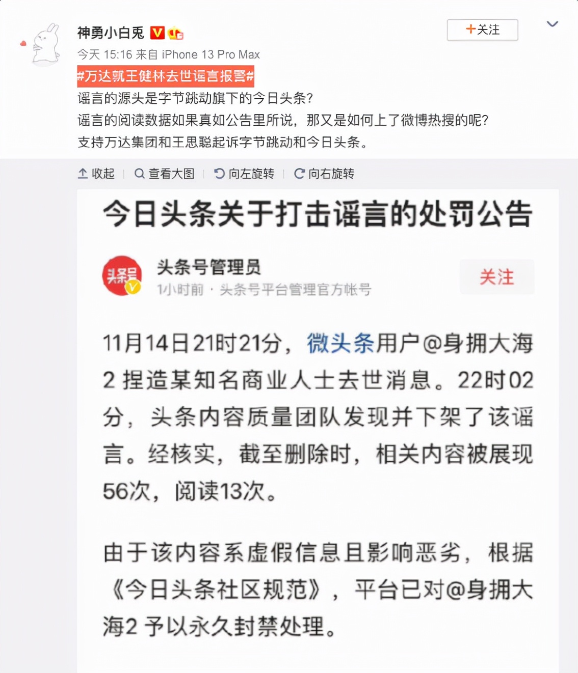 到15號下午,今日頭條宣佈,永久封禁了發佈謠言、獲得13個閲讀的賬號。微博再次出手,另一話題#造謠王健林去世賬號已被永久封禁#,迅速獲得流量,並最高進入微博熱搜第11。