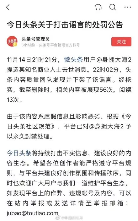 頭條號管理員發佈《今日頭條關於打擊謠言的處罰公告》。