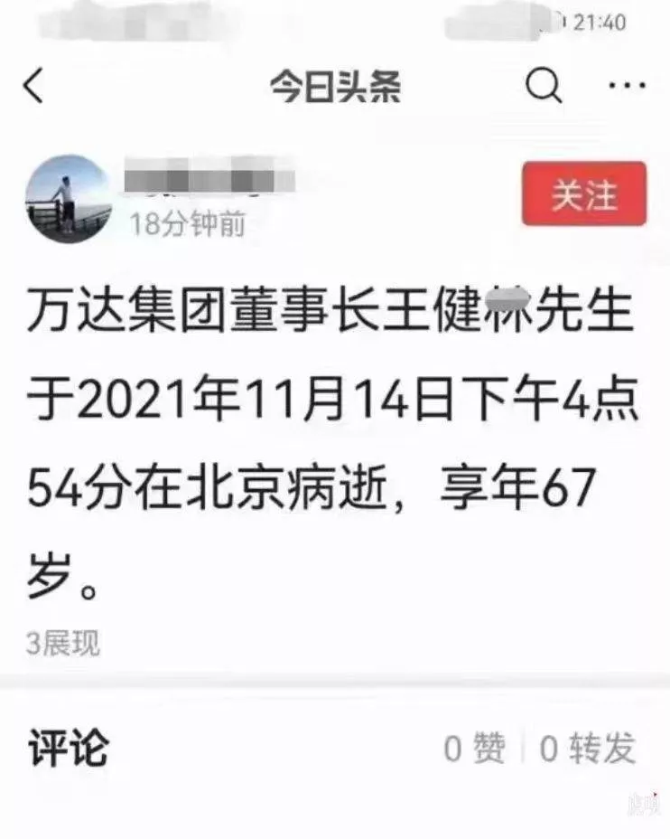 只有8個粉絲的今日頭條用户@身擁大海2 發佈消息稱,萬達集團董事長王健林於2021年11月14日下午4點54分在北京病逝,享年67歲。